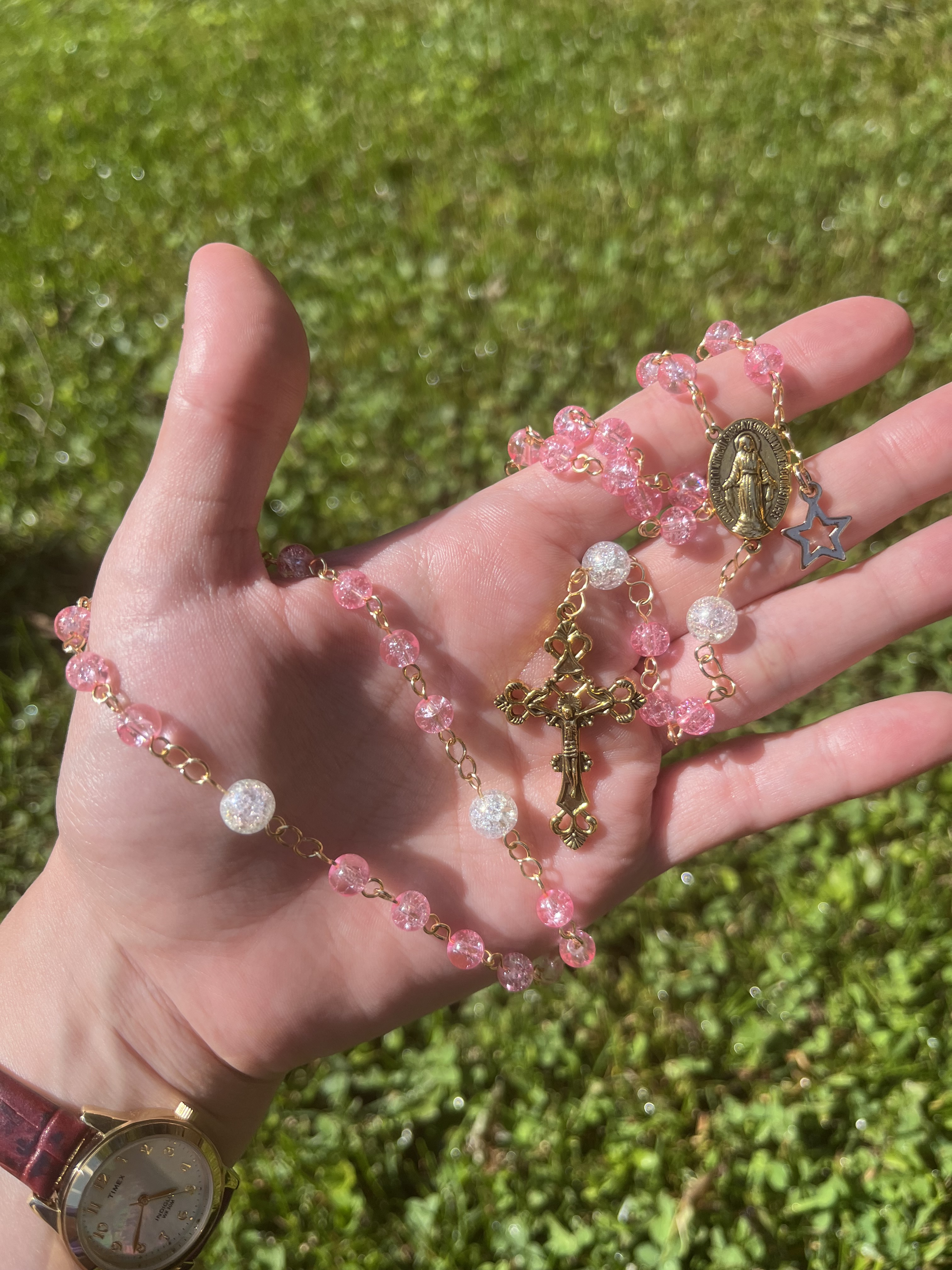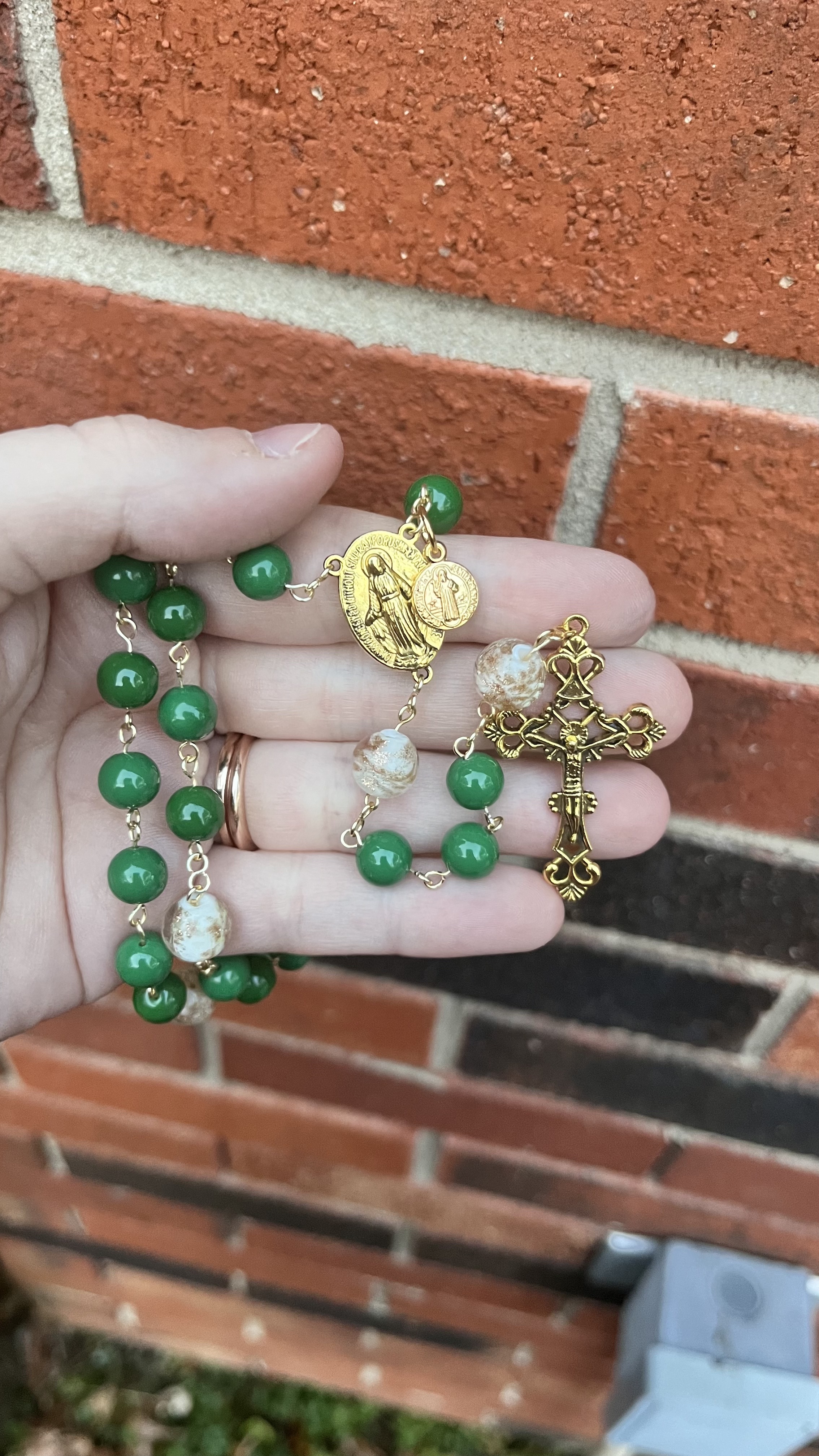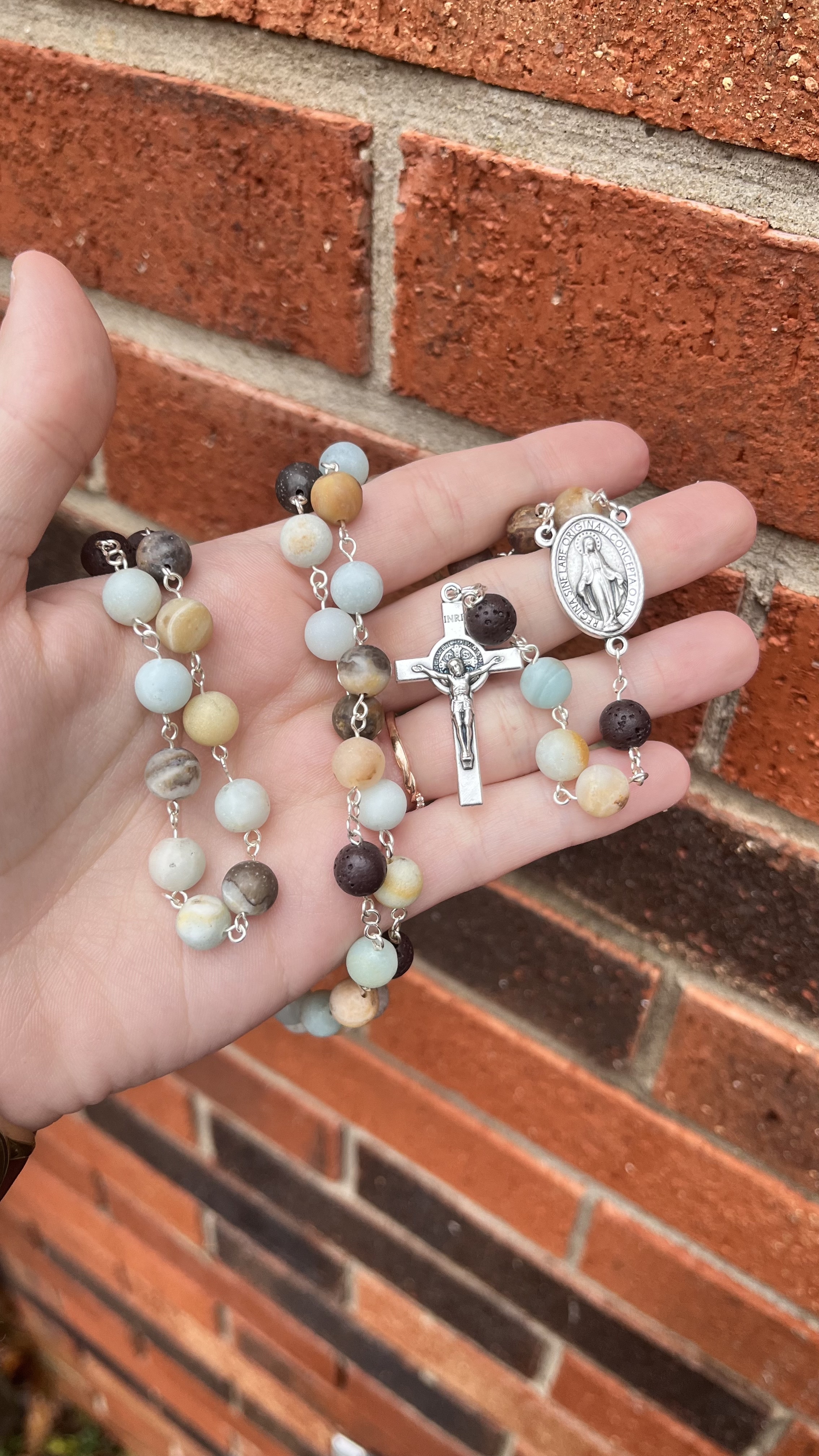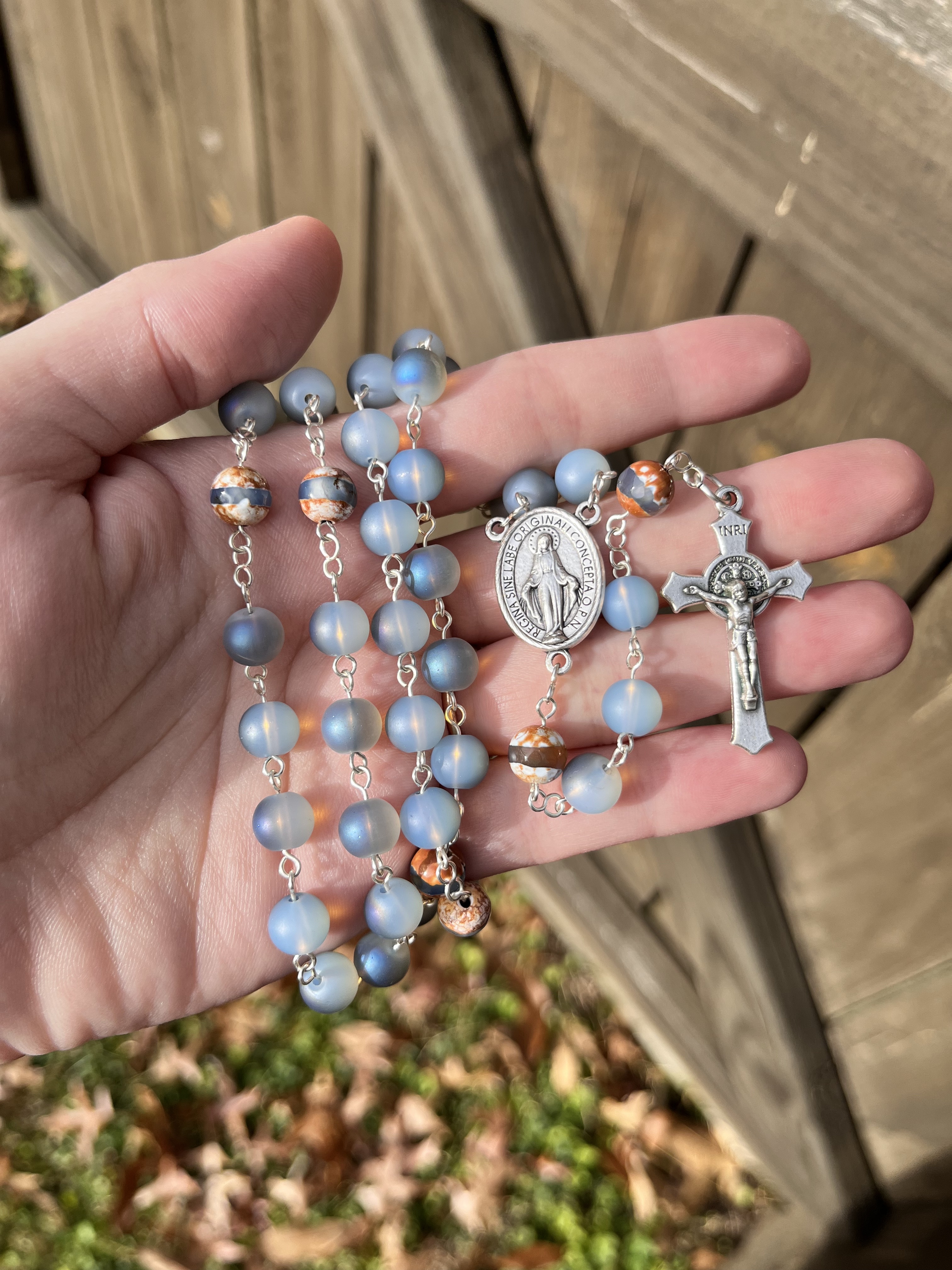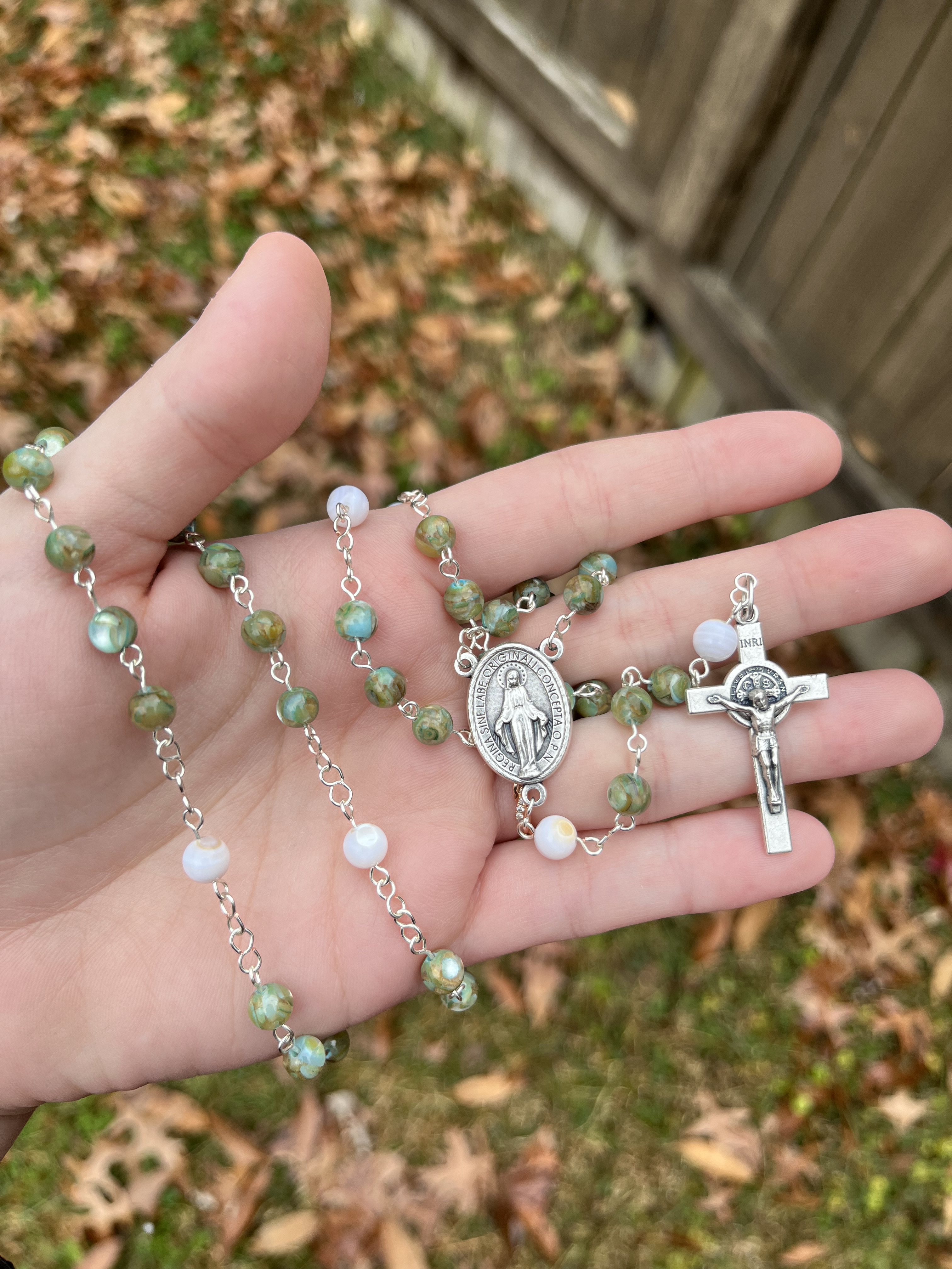 Here, you can find photos of past gifted or commissioned rosaries. To view my current offerings, please take a look at the slideshow gallery on the “Request a Rosary” page.